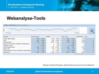 Das Dokument behandelt die datenschutzkonforme Umsetzung von Webtracking-Tools wie Google Analytics im Kontext des deutschen Datenschutzgesetzes. Es wird erläutert, dass die Verarbeitung von Nutzerdaten, insbesondere IP-Adressen, ohne ausdrückliche Einwilligung problematisch ist und es Empfehlungen gibt, alternative Analyse-Tools zu verwenden. Zudem wird auf die Notwendigkeit der Einhaltung bestimmter rechtlicher Vorgaben hingewiesen, einschließlich der Erstellung von Nutzungsprofilen und der Sicherstellung von Widerspruchsmöglichkeiten für die Nutzer.