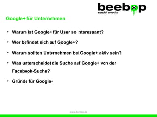 Google+ für Unternehmen bietet eine neue Social-Network-Plattform, die Google-Dienste integriert und Nutzern einzigartige Funktionen wie Hangouts und Circles ermöglicht. Unternehmen sollten aktiv auf Google+ sein, da die Plattform durch ihre Nähe zur Suchmaschine bedeutenden Einfluss auf SEO hat und die Sichtbarkeit von Inhalten durch das +1-System erhöht. Google+ hat schnell eine große Nutzerbasis gewonnen und bietet Unternehmen die Möglichkeit, ihre Reichweite und Vernetzung zu optimieren.