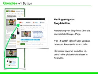Das Dokument beleuchtet die Möglichkeiten, die Google+ Unternehmen bietet, darunter die Bewertung und Verbreitung von Blog-Inhalten über den +1-Button, wodurch die Sichtbarkeit und das Ranking in Suchergebnissen verbessert werden können. Es wird auch die Zielgruppe der typischen Google+-Nutzer beschrieben sowie die Vorteile von Funktionen wie Hangouts zur Kundenbindung. Zudem wird auf die Flexibilität hingewiesen, über diverse Themen zu berichten, um das organische Ranking weiter zu optimieren.