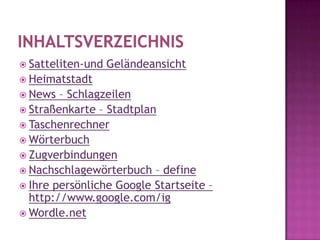 Das Dokument beinhaltet verschiedene digitale Ressourcen und Tools wie Satelliten- und Geländeansichten, Nachrichten, Karten, ein Wörterbuch und einen Taschenrechner. Es erwähnt auch die Verwendung eines Google-Handys und enthält einen Link zu einem YouTube-Film. Die Informationen scheinen einen Bezug zur Heimatstadt der Autoren zu haben.