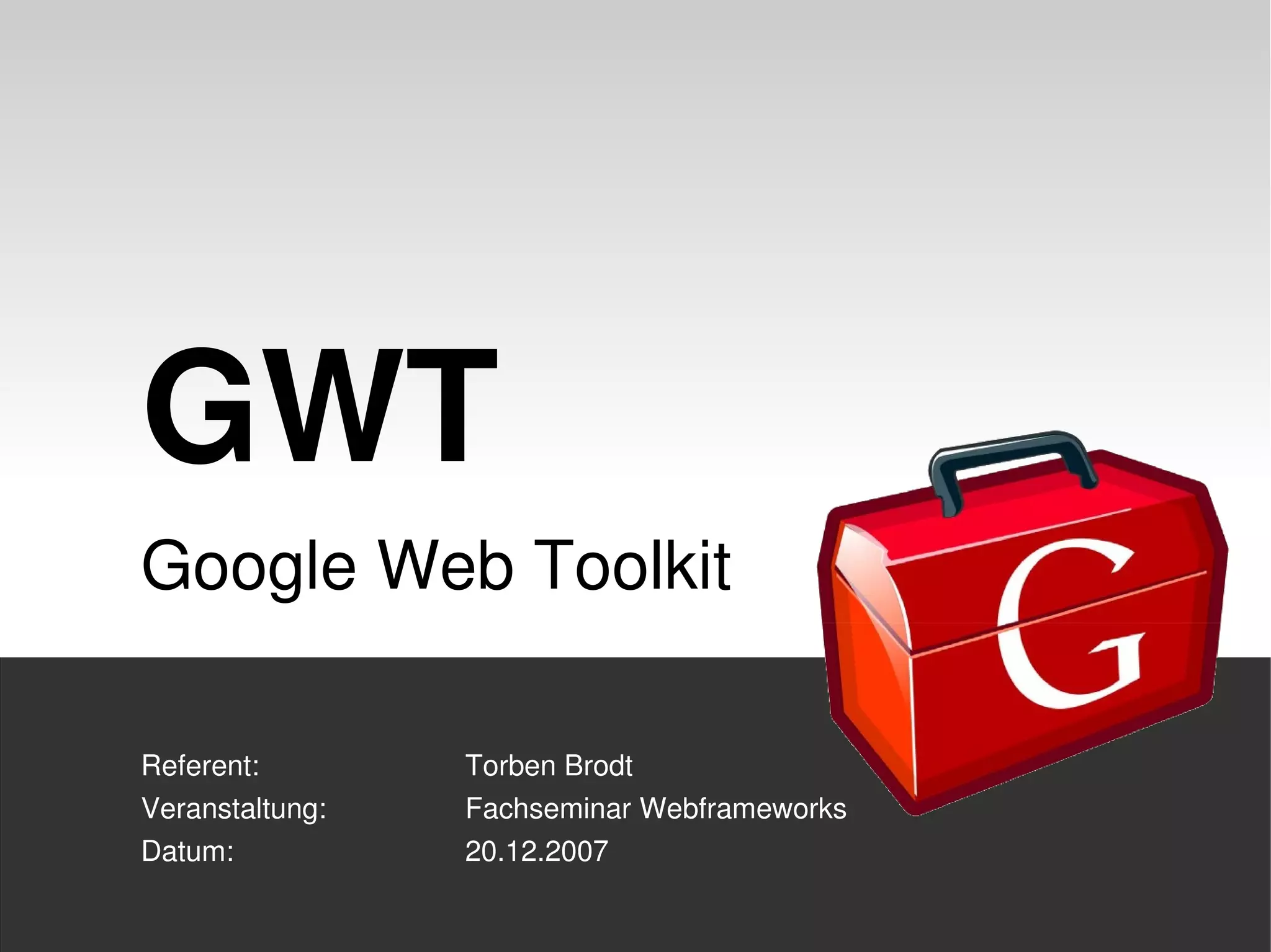 Das Dokument beschreibt das Google Web Toolkit (GWT), ein Framework zur Entwicklung von Webanwendungen, das es ermöglicht, Java-Code zu schreiben, der in JavaScript übersetzt wird. Es hebt die Vorteile des GWT hervor, einschließlich verbesserter Leistung durch Imagebundles, Typisierung, Debugging-Funktionalitäten und die Möglichkeit, die Benutzeroberfläche mithilfe von Widgets zu gestalten. Zudem werden die Features des GWT erläutert, wie AJAX-Integrationen, internationale Unterstützung sowie Methoden zum Testen und Benchmarking.