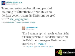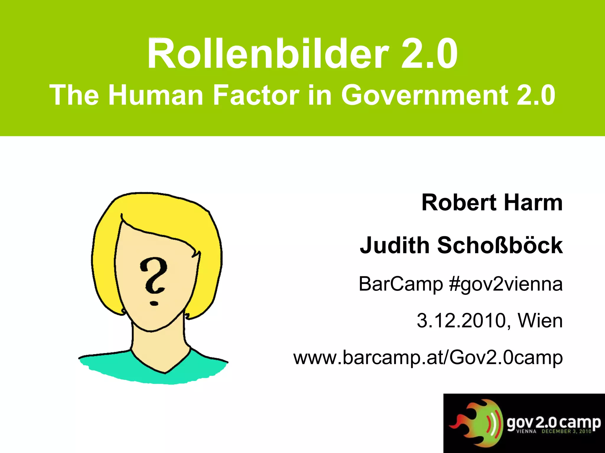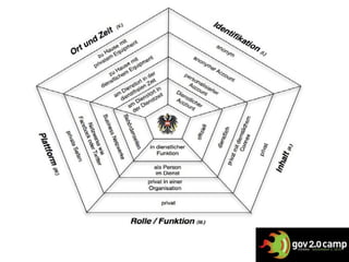Das Dokument behandelt die Veränderungen von Rollenbildern im Kontext von Government 2.0 und betont die Bedeutung des menschlichen Faktors in der Transformation von Regierungsstrukturen. Es wird diskutiert, wie Social Media die Rollen von Mitarbeitern beeinflusst und wie Identitäten nicht mehr statisch sind, was zu Rollenkonflikten führen kann. Zudem werden Richtlinien für die Nutzung von Social Media und die Grenzen zwischen persönlicher und beruflicher Nutzung thematisiert.