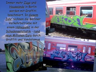 In Berlin sind Graffiti und Vandalismus ein wachsendes Problem, das die Berliner Verkehrsbetriebe bis zum Jahresende mit rund neun Millionen Euro an Schäden belastet. Besonders auffällig sind künstlerische Graffiti, die oft schwer thematisch zuzuordnen sind. Ein Beispiel ist ein Kunstwerk mit einem 'Geld-Motiv' an der Seite einer Bank.