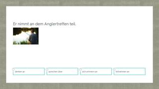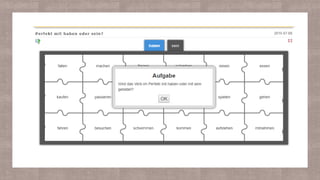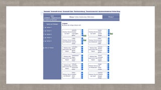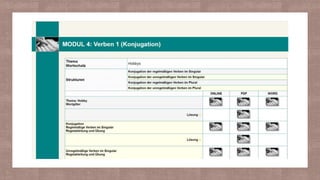 Das Dokument bietet eine Übersicht über verschiedene Online-Ressourcen zur deutschen Grammatik, einschließlich Übungen und Konjugatoren für Verben. Es behandelt zentrale Themen wie Satzstrukturen, Nomen, Personalpronomen, Verben, Adjektive und Nebensätze. Zudem wird auf die Möglichkeit hingewiesen, eigene Übungen mit Hilfe von Übungsgeneratoren zu erstellen.