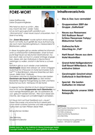 Der Newsletter der Xing-Gruppe "Golfurlaub" bietet Informationen zu verschiedenen Golfreisemöglichkeiten in Deutschland, darunter die Golfwoche Ruhr und das Midsummer Funturnier im Radisson SAS Resort Schloss Fleesensee. Es werden außerdem exklusive Gewinnspiele für Golfurlaube sowie Neuigkeiten zu Hotelangeboten und internationalen Golfplätzen vermeldet. Besonderes Augenmerk liegt auf der Förderung von Golfreisen innerhalb Deutschlands und den bevorstehenden Event-Termine.