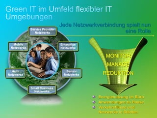 Das Dokument erläutert die zentrale Rolle von Netzwerken in einer von Cloud-Computing, Mobilität und Datenflut geprägten IT-Umgebung, wobei Cisco Strategien zur Energieoptimierung und Effizienzsteigerung präsentiert. Es wird betont, dass Unternehmen durch intelligente Netzwerke und innovative Technologien wie EnergyWise signifikante Energieeinsparungen und verbesserte Betriebsabläufe erzielen können. Ebenso wird die Notwendigkeit der Zusammenarbeit mit Partnern zur Implementierung smarter Energieversorgungssysteme hervorgehoben.