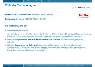 Die Testkampagne für Suchmaschinenmarketing zielte darauf ab, Neukunden zu gewinnen und die Effektivität bestimmter Keywords zu analysieren. Während der Testdauer von zwei Monaten wurden verschiedene Anzeigenschaltungen optimiert und die Kampagnenergebnisse entsprechend ausgewertet, was zu steigenden Klickzahlen und einer Verbesserung der Conversion-Rate führte. Die Analysen zeigten, dass ein Großteil der Nutzer innerhalb kurzer Zeit Bestellungen aufgab und dass die Implementierung neuer Landingpages sowie kontinuierliche Optimierungen entscheidend für den Erfolg der Kampagne waren.