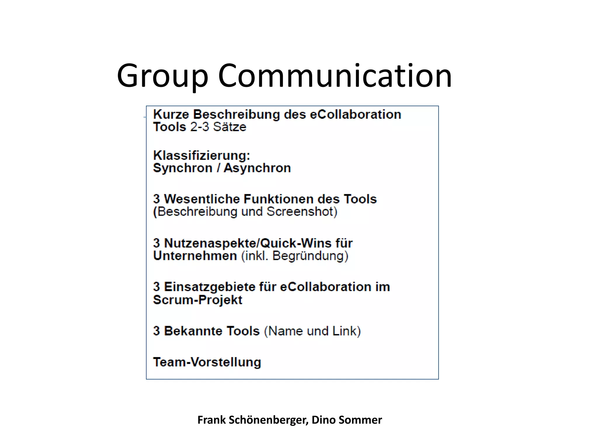 Das Dokument behandelt Software zur Unterstützung der Kommunikation zwischen Individuen und klassifiziert diese als asynchron. Es beschreibt Funktionen wie Kalender, Whiteboards und Text Messaging sowie Vorteile wie schnellen Informationsaustausch und bessere Teamübersicht. Insbesondere wird der Einsatz in Scrum hervorgehoben, wo Daily-Scrums und Sprint-Kommunikation stattfinden können.
