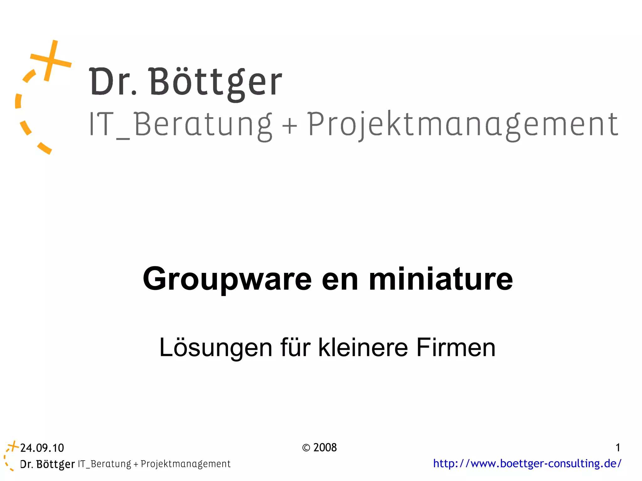 Das Dokument bietet eine umfassende Analyse von Groupware-Lösungen, speziell für kleine Unternehmen, unter der Leitung von Dr. Christian Böttger, einem IT-Experten. Es diskutiert verschiedene Groupware-Optionen, die besonderen Anforderungen und Herausforderungen kleiner Firmen sowie den notwendigen Support und die Kompatibilität mit mobilen Endgeräten. Des Weiteren werden Vor- und Nachteile der jeweiligen Lösungen beleuchtet, um Entscheidungsprozesse zu erleichtern.