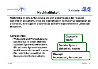 Das Dokument behandelt die Konzepte der nachhaltigen Entwicklung und wie Bildung dabei eine zentrale Rolle spielt, insbesondere durch Umweltmanagementsysteme in Schulen. Es beschreibt die Umsetzung der Agenda 21 in Aalen, die die lokale Gemeinschaft in die Entwicklung von Nachhaltigkeitsstrategien einbezieht, und hebt die Bedeutung von Erziehung und Verhaltensänderung hervor. Die Initiative 'Grüner Aal' dient als Beispiel für die Integration von Umweltschutz in Schulen und fördert eine kontinuierliche Verbesserung der Umweltleistung.