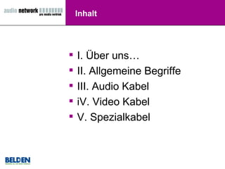Das Dokument behandelt die Grundlagen der Kabeltechnik im Bereich Audio-, Video- und Medientechnik, einschließlich der Definitionen und Eigenschaften von verschiedenen Kabeltypen und deren Anwendungen. Es werden wichtige Begriffe wie Impedanz, Dämpfung und Rückflussdämpfung erläutert, sowie spezielle Kabel für analoge und digitale Audio- und Videosignale beschrieben. Zudem werden die Vorteile halogenfreier Kabel und die Bedeutung von speziellen Kabeldesigns für die Leistung und Signalübertragung hervorgehoben.