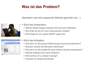 Das Dokument behandelt die Herausforderungen und Lösungen im Kontext von 'guided navigation' und 'faceted search' für Websites, mit einem Fokus auf Nutzererfahrung und Datenstrukturierung. Es wird auf die Bedürfnisse von Anwendern und Anbietern eingegangen, sowie auf die Bedeutung von Metainformationen und interdisziplinären Teams bei der Erstellung effektiver Websites. Der Autor gibt auch Beispiele aus der Reise- und Jobbranche sowie Hinweise zur Informationsarchitektur und Budgetierung.