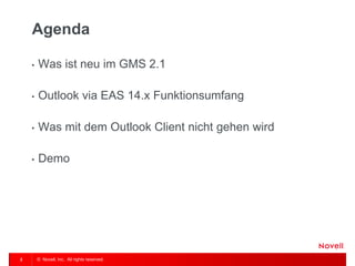 Das Dokument behandelt neue Funktionen und Anforderungen der GroupWise-Integration mit Outlook über EAS 14.x, einschließlich Funktionen wie mobile Notizen und Synchronisierung von Kontakten. Es werden Einschränkungen aufgezeigt, wie die Unfähigkeit, bestimmte Serverregeln anzuwenden und die Nichtverfügbarkeit des Systemadressbuchs. Abschließend werden wichtige Produktmanager vorgestellt, die während der Veranstaltung verfügbar sind.
