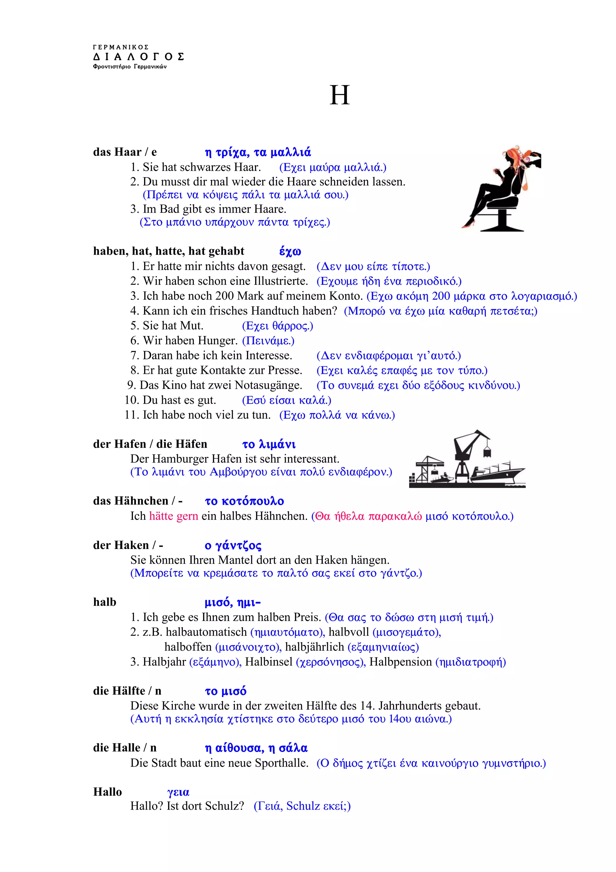 Das Dokument enthält eine Vielzahl von Beispielsätzen in deutscher Sprache, die verschiedene Wörter und deren Verwendung veranschaulichen. Themen umfassen alltägliche Ausdrücke über Haare, Haltestellen, Haushalt und spezifische Tätigkeiten. Es bietet einen Einblick in die Grammatik und den Wortschatz der deutschen Sprache.