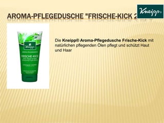Das Dokument beschreibt verschiedene Produkte von Kneipp Schweiz, insbesondere die Aroma-Pflegedusche 'Frische-Kick' sowie Shampoos und Pflegespülungen mit natürlichen Inhaltsstoffen wie Erdbeere, Kamille und Mandelblüten. Es wird auf die pflegenden Eigenschaften dieser Produkte hingewiesen, die das Haar intensiver schützend und pflegend wirken lassen. Zudem bietet das Unternehmen Kontaktmöglichkeiten für Fragen oder Anregungen zu den Produkten an.