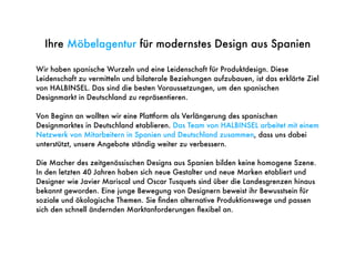 Die Firma Halbinsel hat sich zum Ziel gesetzt, den spanischen Designmarkt in Deutschland zu repräsentieren und arbeitet mit einem Netzwerk von Herstellern zusammen, um qualitativ hochwertige und innovative Designs zu fördern. Verschiedene spanische Designer und Unternehmen, darunter Viccarbe und Mobles 114, kombinieren traditionelles Handwerk mit modernen Designs, während Nachhaltigkeit und soziale Verantwortung in der aktuellen Designszenen zunehmend an Bedeutung gewinnen. Die Produkte und Designs zeichnen sich durch mediterranes Lebensgefühl und hohe Qualität aus und finden international Anerkennung.