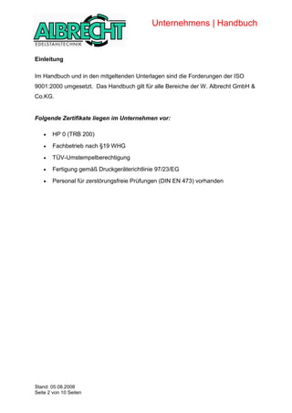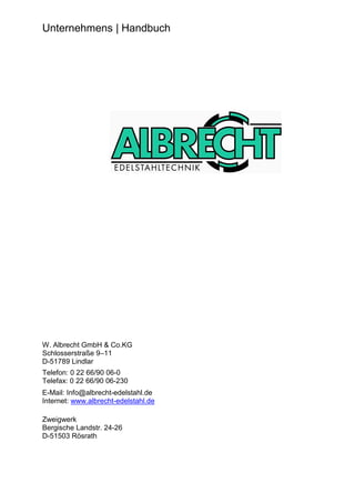Das Unternehmenshandbuch der W. Albrecht GmbH & Co. KG umfasst die Anforderungen der ISO 9001:2000 und beschreibt die Geschichte und Entwicklung des Unternehmens, das seit 1634 aktiv ist. Das Unternehmen legt Wert auf Qualität, Innovation und Kundenzufriedenheit, wobei es sich auf die chemische Industrie, den Maschinenbau und die Lebensmittelindustrie konzentriert. Es werden Maßnahmen zur Qualitätssicherung und stetigen Verbesserung der Prozesse implementiert, um die Bedürfnisse der Kunden zu erfüllen und gleichzeitig die Mitarbeiter und die Umwelt zu verantworten.