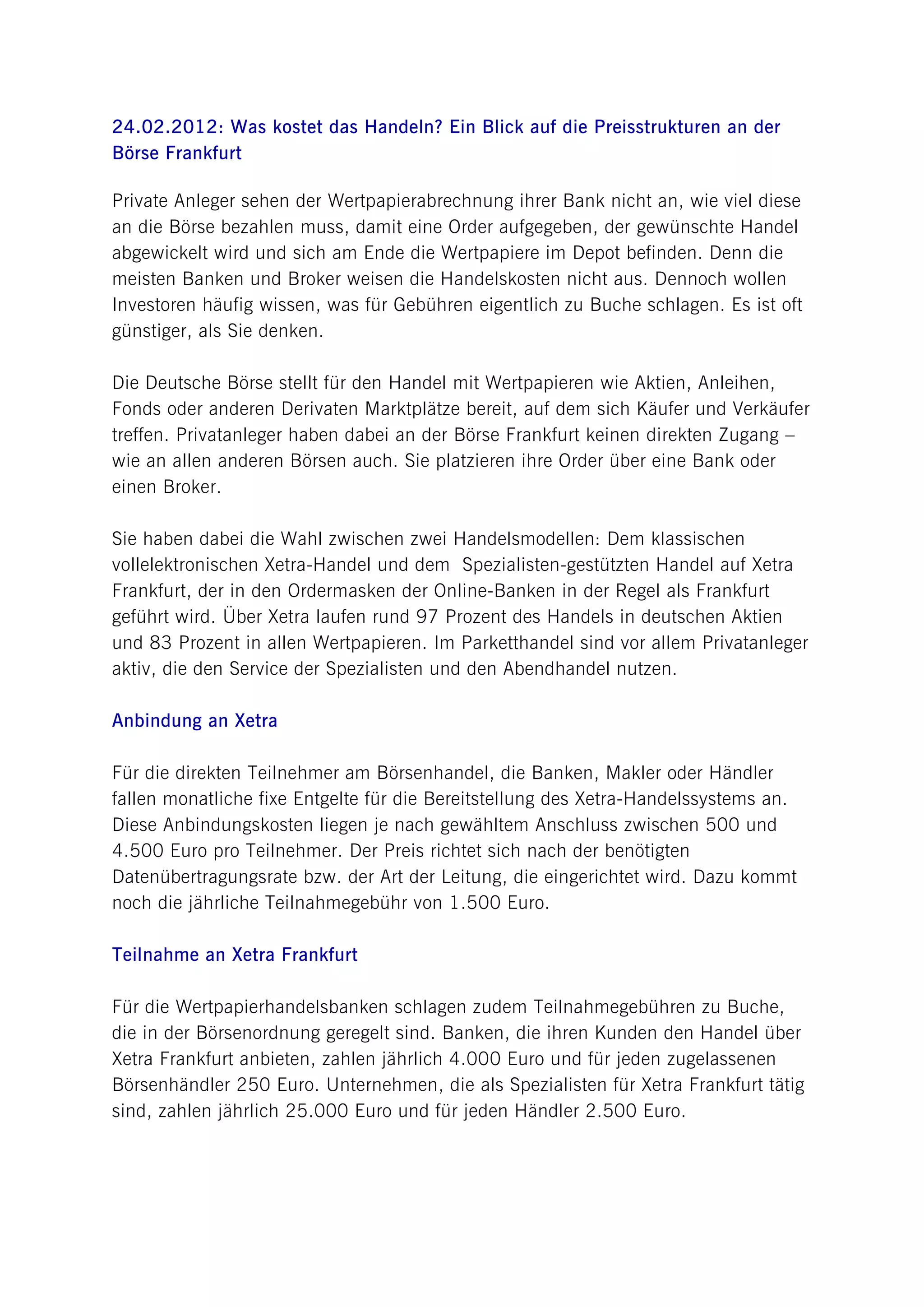 Das Dokument beschreibt die Preisstrukturen und Handelskosten für den Wertpapierhandel an der Börse Frankfurt, die von Banken und Brokern erhoben werden. Privatanleger haben keinen direkten Zugang zur Börse und können zwischen verschiedenen Handelsmodellen wählen, wobei die Kosten von Transaktionsvolumina und Gebührenmodellen abhängen. Es werden sowohl fixe als auch variable Kosten genannt, die in verschiedenen Szenarien, einschließlich Clearing und Settlement, variieren können.