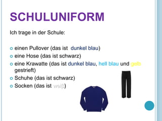 Das Dokument beschreibt die Schuluniform der Schüler an der Schule St. Aidan's, die aus einem dunkelblauen Pullover, schwarzen Hosen, einer gestreiften Krawatte sowie schwarzen Schuhen und weißen Socken besteht. Es listet auch die verschiedenen Schulfächer auf, die die Schüler belegen, darunter Mathe, Sport, Kunst und mehrere Fremdsprachen. Zudem wird erwähnt, dass die Schule ein vielfältiges Kursangebot in verschiedenen Fachbereichen bietet.
