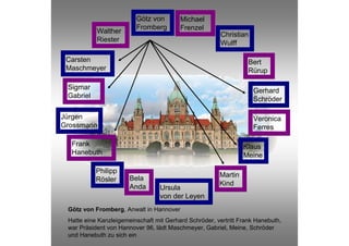 Das Dokument beschreibt die Beziehungen und Netzwerke prominenter Persönlichkeiten in Hannover, darunter Götz von Fromberg, Gerhard Schröder, Sigmar Gabriel und viele weitere. Es wird die enge Verknüpfung zwischen Politik, Wirtschaft und Unterhaltung aufgezeigt, sowie die persönlichen und geschäftlichen Beziehungen der genannten Personen. Außerdem werden die Rollen und Positionen der Individuen im politischen und wirtschaftlichen Kontext erläutert.