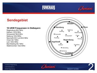 Das Dokument beschreibt die Leistungen des Internetradios und den Einsatz einer iPhone-Anwendung durch Funkhaus Regensburg. Es gibt Hinweise auf Reichweiten von 330.000 Hörern, monatliche Webradio-Nutzung von 700.000 Minuten und die Bedeutung regionaler Inhalte für mobile Nutzer. Die Entwicklung der App und der Wettbewerb auf dem Markt werden ebenfalls thematisiert.