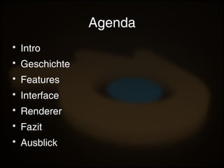 Das Dokument bietet eine Einführung in Blender, einschließlich seiner Geschichte seit 1994, seiner Entwicklung zur Open-Source-Software und der großen Community von Nutzern. Es beschreibt die Hauptfunktionen von Blender wie Modellierung, Animation und Rendering sowie verschiedene Renderer und deren Eigenschaften. Abschließend wird auf die Möglichkeit von Workshops hingewiesen und ein Ausblick auf zukünftige Entwicklungen gegeben.