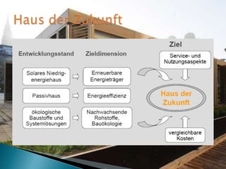 Das Dokument beschreibt das Konzept des 'Haus der Zukunft', das auf eine deutliche Reduzierung des Energie- und Stoffeinsatzes abzielt und den Einsatz erneuerbarer Energien sowie einen effizienten Rohstoffeinsatz fördert. Zudem wird mehr Komfort für die Benutzer angestrebt, einschließlich der Nutzung nachwachsender Rohstoffe, flexibler Anpassungsmöglichkeiten und einer belästigungsarmen Sanierung. Darüber hinaus werden innovative Baumaterialien und Techniken wie Fassadenkollektoren, Passivhausfenster und Regenwassernutzung vorgestellt.