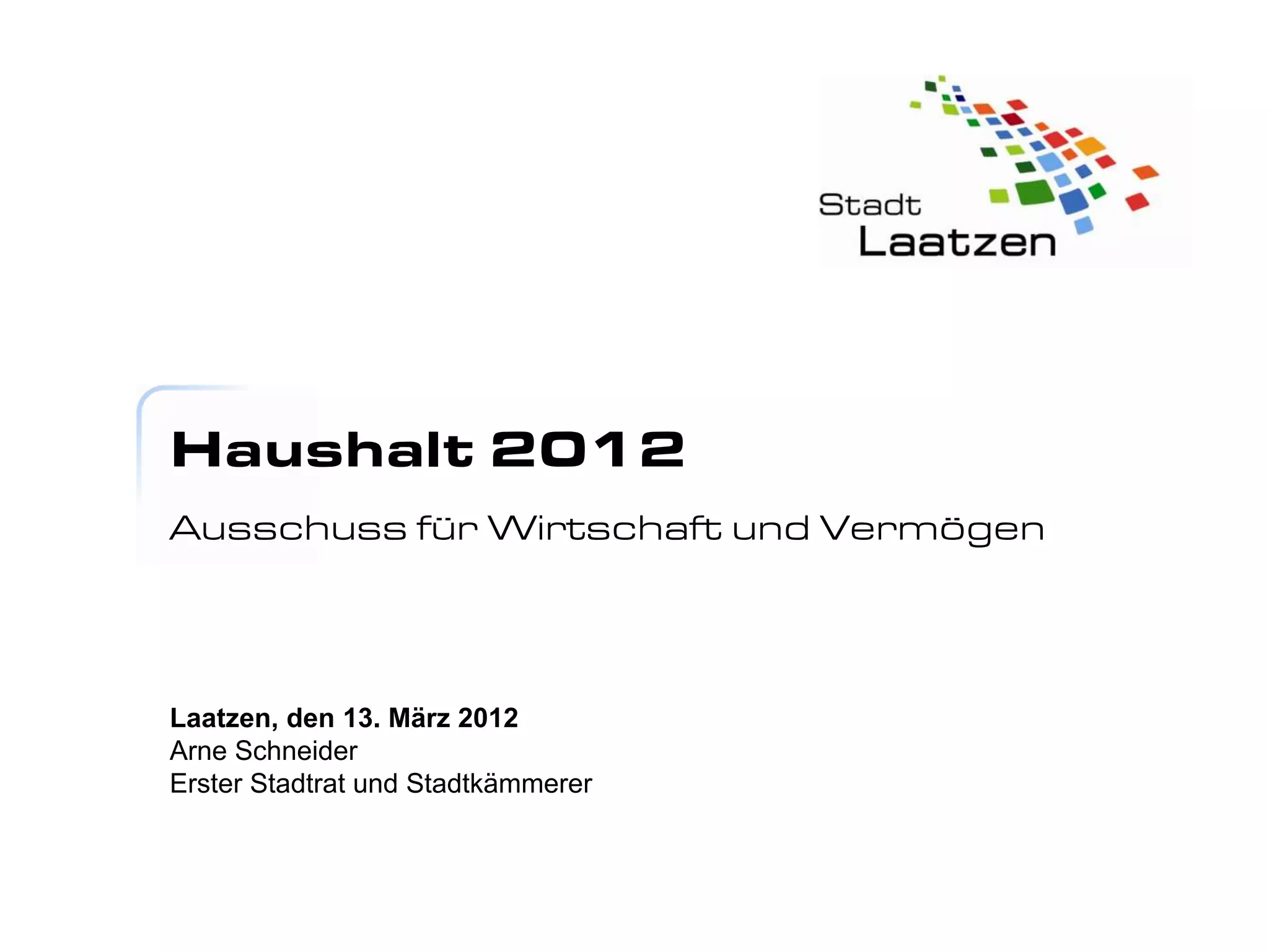 Der Haushalt 2012 der Kommune Laatzen legt grundlegende Ziele für die Entwicklung fest, einschließlich eines Investitionsprogramms und eines Haushaltssicherungskonzepts. Die politischen Entscheidungen betreffen die Erreichung bestimmter Ziele durch definierte Programme und Budgets. Zudem werden Kennzahlen zur Zielerreichung in verschiedenen Teilhaushalten präsentiert, um ein effektives Verwaltungshandeln zu gewährleisten.