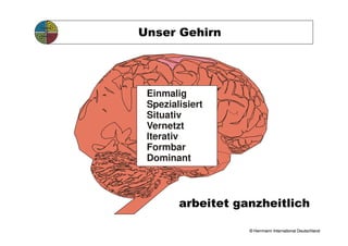 Das Dokument beschreibt das Herrmann-Dominanz-Modell, das verschiedene Denk- und Verhaltensstile von Menschen untersucht. Es identifiziert vier dominante Denkstile, die durch unterschiedliche neuronale Netzwerke im Gehirn repräsentiert werden, und betont die Bedeutung dieser Stile für das Lernen, die Kommunikation sowie die individuelle Entwicklung. Zudem werden die Merkmale und Präferenzen der einzelnen Persönlichkeitsprofile erläutert, um die Vielfalt menschlicher Denkweisen zu verdeutlichen.