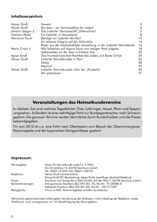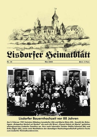 Das Dokument ist die 10. Ausgabe des 'Lisdorfer Heimatblattes', die verschiedene Beiträge zur Geschichte und Kultur von Lisdorf enthält, darunter Berichte über lokale Veranstaltungen, Mundart und historische Ereignisse an der Saar. Der Vorsitzende Heiner Groß entschuldigt sich für die verspätete Veröffentlichung, die durch seine gesundheitlichen Probleme verursacht wurde, und kündigt bevorstehende Reisen und feierliche Anlässe an. Die Ausgabe enthält auch historische Reminiszenzen über das Gemüseschiff 'Dillenschass' und die Herausforderungen der Bevölkerung im Zusammenhang mit Hochwasser und Risiken beim Baden in der Saar.