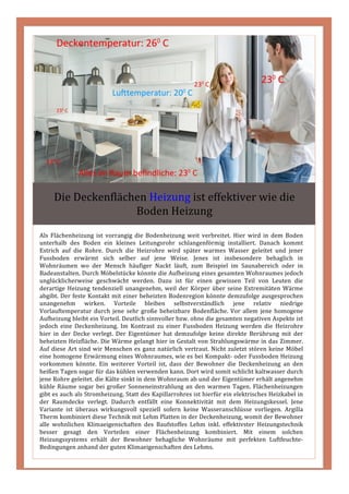 Das Dokument vergleicht die Effektivität von Boden- und Deckenheizungen, wobei die Deckenheizung als vorteilhafter angesehen wird, da sie eine gleichmäßige Wärmeverteilung bietet, ohne dass Möbel die Wärmeübertragung beeinträchtigen. Deckenheizungen können auch zum Kühlen von Räumen genutzt werden, indem kaltes Wasser durch die Rohre geleitet wird. Eine spezielle Kombination aus Deckenheizung und Lehmplatten wird als optimale Lösung für angenehme Wohnräume mit idealen Luftfeuchtigkeitsbedingungen beschrieben.