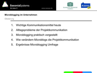 Das Dokument behandelt die Nutzung von Microblogging, insbesondere durch das Tool Yammer, als Kommunikationsmittel innerhalb der Saxonia Systems AG und hebt dessen positive Auswirkungen auf Transparenz, Problemlösungsfähigkeiten und Informationsaustausch hervor. Es werden sowohl Vorteile wie weniger E-Mails und eine höhere Vernetzung als auch negative Aspekte wie Informationsflut und keine Verbesserung in der Effizienz der Projektkommunikation diskutiert. Die Umfrageergebnisse zeigen, dass eine Mehrheit der Mitarbeiter bereits Erfahrung mit Microblogging hat, jedoch auch Bedenken zur Datensicherheit und Bedienbarkeit bestehen.