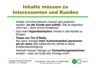 Das Dokument behandelt die Herausforderungen und Chancen der Hyperdistribution in der crossmedialen Marketingkommunikation für Verlage. Es wird betont, dass Verlage sich zu Vermarktungsmaschinen entwickeln müssen, um in einer fragmentierten Medienlandschaft erfolgreich zu sein, indem sie ihre Inhalte über verschiedene Kanäle verbreiten und sich an das veränderte Kundenverhalten anpassen. Der Schwerpunkt liegt auf der Notwendigkeit, den Markenkern klar zu definieren und innovative Preismodelle sowie Vertriebsstrategien in der digitalen Welt zu entwickeln.