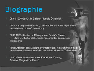 Hermann Kesten wurde am 28. Januar 1900 in Galizien geboren und wuchs in Nürnberg auf. Er studierte in Deutschland, emigrierte 1933 wegen des Nationalsozialismus nach Frankreich und später in die USA, wo er sich aktiv für die Rettung verfolgter Schriftsteller einsetzte. Kesten veröffentlichte mehrere bedeutende Werke und erhielt zahlreiche Ehrungen, darunter die Ehrendoktorwürde von Universitäten und den Nelly Sachs Kulturpreis der Stadt Dortmund.