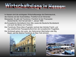 Hessen ist ein Bundesland in Deutschland mit etwa 6 Millionen Einwohnern und Wiesbaden als Hauptstadt. Frankfurt am Main ist der bekannteste Finanzplatz des Landes und bietet eine multikulturelle Atmosphäre, zahlreiche Sehenswürdigkeiten und eine hohe Lebensqualität, jedoch auch Probleme mit Kriminalität. Wichtige Wirtschaftszweige in Hessen sind Elektrotechnik, Chemie und Automobilbau, während der Flughafen Frankfurt als einer der verkehrsreichsten in Europa gilt.