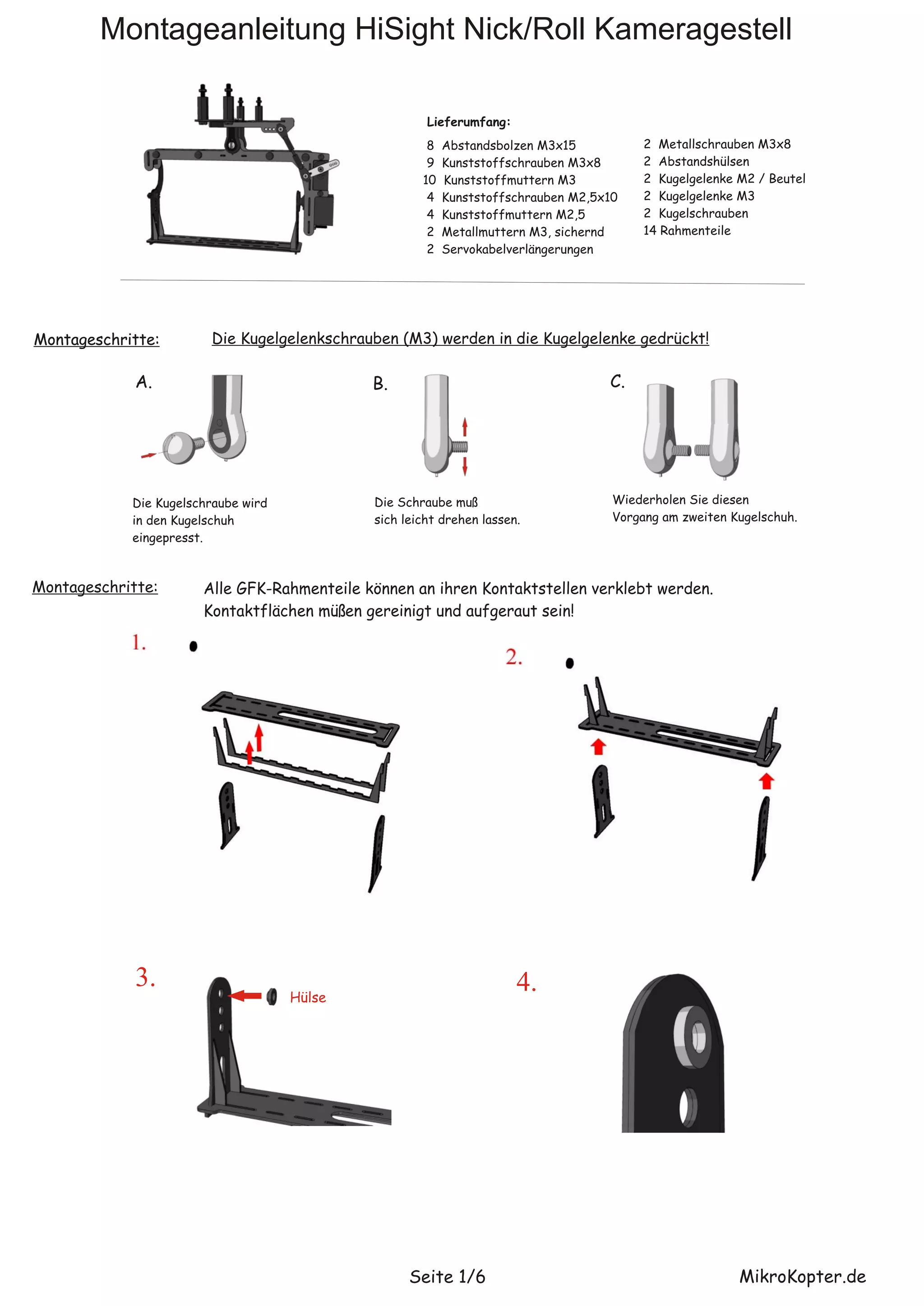 Die Montageanleitung für das Hisight Nick/Roll Kameragestell beschreibt den Lieferumfang und die einzelnen Montageschritte, die zur Zusammenstellung erforderlich sind. Es werden spezifische Teile wie Schrauben, Bolzen und Kugelgelenke aufgelistet, sowie Anweisungen zur Verklebung und Montage der Rahmenteile gegeben. Zudem wird erwähnt, dass das Kameragestell in drei Höhen verstellbar ist.