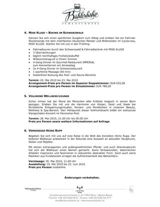 Im Mai 2010 finden verschiedene Veranstaltungen in der Bühlerhöhe statt, darunter informative Schlossgespräche über Finanzplanung, klassische Schlosskonzerte und ein Krimidinner. Außerdem gibt es ein sportliches Fahrradwochenende mit Radsportler Mike Kluge, eine Vollmond-Wellness-Lounge sowie eine Vernissage des Künstlers Heinz Rupp. Die Veranstaltungen bieten eine Vielfalt an Erlebnissen, von Kulinarik über Musik bis hin zu Kunst und Wellness.