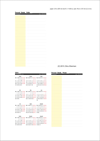 Das Dokument beschreibt die Spezifikationen und Layouts von verschiedenen Karten und Kalendern für einen DIY-Organizer, der im hipster PDA-Stil gehalten ist. Es enthält Details zu Papierformaten und Kartenmaße sowie persönliche und wichtige Daten, die auf den Karten aufgezeichnet werden können. Das Dokument umfasst auch Monatskalender für die Jahre 2013 und 2014 und wichtige Informationen für die Benutzer.