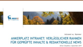 Das Dokument vergleicht Intranet und Yammer als Kommunikationsmittel und betont die Bedeutung geprüfter Inhalte auf Plattformen wie dem Intranet. Es hebt hervor, dass Mitarbeiter eine benutzerfreundliche und leicht zugängliche Informationsquelle wünschen und das Intranet weiterhin relevant bleibt, indem es redaktionelle Inhalte bereitstellt. Unterschiedliche Informationsarten und Kanäle werden empfohlen, um die spezifischen Bedürfnisse der Nutzer zu erfüllen.