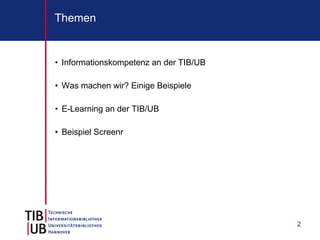 Das Dokument behandelt die Förderung von Informationskompetenz und E-Learning an der TIB/UB, zum Beispiel durch Schulungen, den Einsatz aktivierender Lehrmethoden und die Entwicklung von E-Learning-Materialien. Es wird betont, dass Informationskompetenz nicht nur vermittelt, sondern aktiv erworben werden muss, unter Berücksichtigung der Bedürfnisse der Studierenden. Die Einführung von Screenr für die Erstellung kurzer Videos zur Unterstützung der Lernenden wird ebenfalls thematisiert.