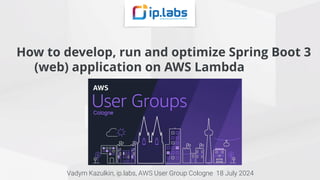 The document provides a comprehensive guide on how to develop, run, and optimize a Spring Boot 3 application on AWS Lambda. It covers the benefits of serverless architecture, migration strategies, and practical implementation details, including code samples and AWS services integration such as DynamoDB, AWS Lambda Web Adapter, and Spring Cloud Function. The agenda includes optimization techniques and various deployment methods for running Java applications in a serverless environment.