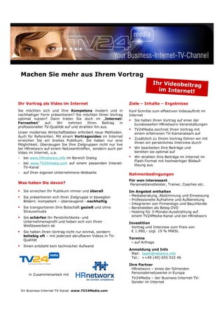 Das Dokument bietet eine Dienstleistung zur professionellen Videoaufzeichnung von Vorträgen, die im Internet ausgestrahlt werden, um die Reichweite und Sichtbarkeit von Referenten zu erhöhen. Es beschreibt die Schritte zur effektiven Präsentation im Internet, einschließlich der Aufnahme in TV-Qualität und der Bereitstellung von Videos auf verschiedenen Plattformen. Zielgruppen sind Personaldienstleister, Trainer und Coaches, die durch diese Methode ihre Zielgruppe gezielt ansprechen können.