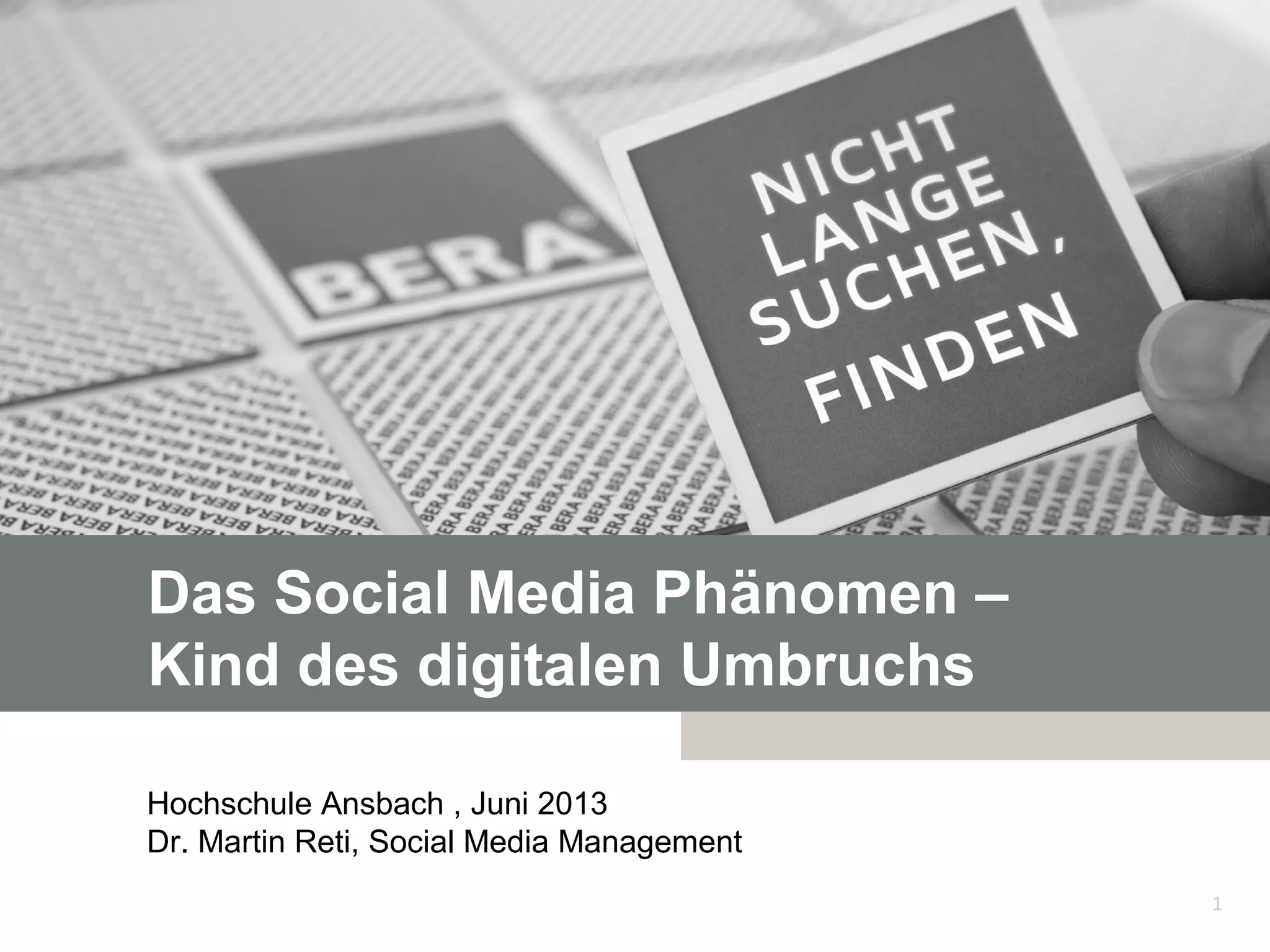 Das Dokument beschreibt die Entwicklung und Bedeutung von Social Media im Rahmen des digitalen Wandels, insbesondere für Unternehmen. Es hebt die Notwendigkeit hervor, in sozialen Medien präsent zu sein, um effektiv kommunizieren und interagieren zu können, und bietet einen Überblick über Reise und Herausforderungen bei der Implementierung von Social Media Strategien. Zudem wird der Multiplikatoreffekt und die Reichweite, die durch User Generated Content entstehen, thematisiert.