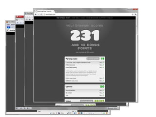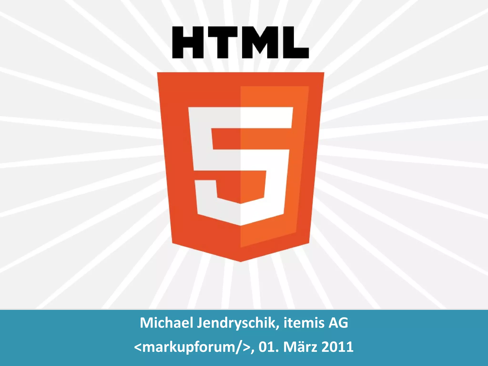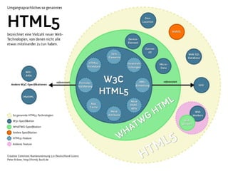 Das Dokument behandelt verschiedene Aspekte von HTML5, einschließlich neuer semantischer Elemente, Audio- und Video-Integration sowie Canvas-Funktionalitäten. Es wird darauf hingewiesen, dass viele Informationen in älteren Ausgaben möglicherweise veraltet sind und dass HTML5 zahlreiche neue Möglichkeiten bietet, die sowohl Entwickler als auch Benutzer ansprechen. Zudem wird auf technische Machbarkeit und Entwicklungsprozesse im Web eingegangen.