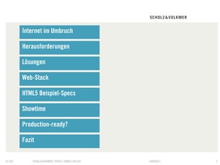 Das Dokument erläutert die Herausforderungen und Lösungen im Kontext von HTML5 und dessen Bedeutung für Web-Entwickler, Designer und Projektmanager. Es behandelt die Entwicklung von Web-Apps, die plattformunabhängige Nutzung und die technischen Anforderungen im Zusammenhang mit der Komplexität von HTML5. Zudem wird auf die Notwendigkeit der Spezialisierung und der Berücksichtigung neuer Technologien und Konzepte hingewiesen, um die Vorteile von HTML5 optimal nutzen zu können.