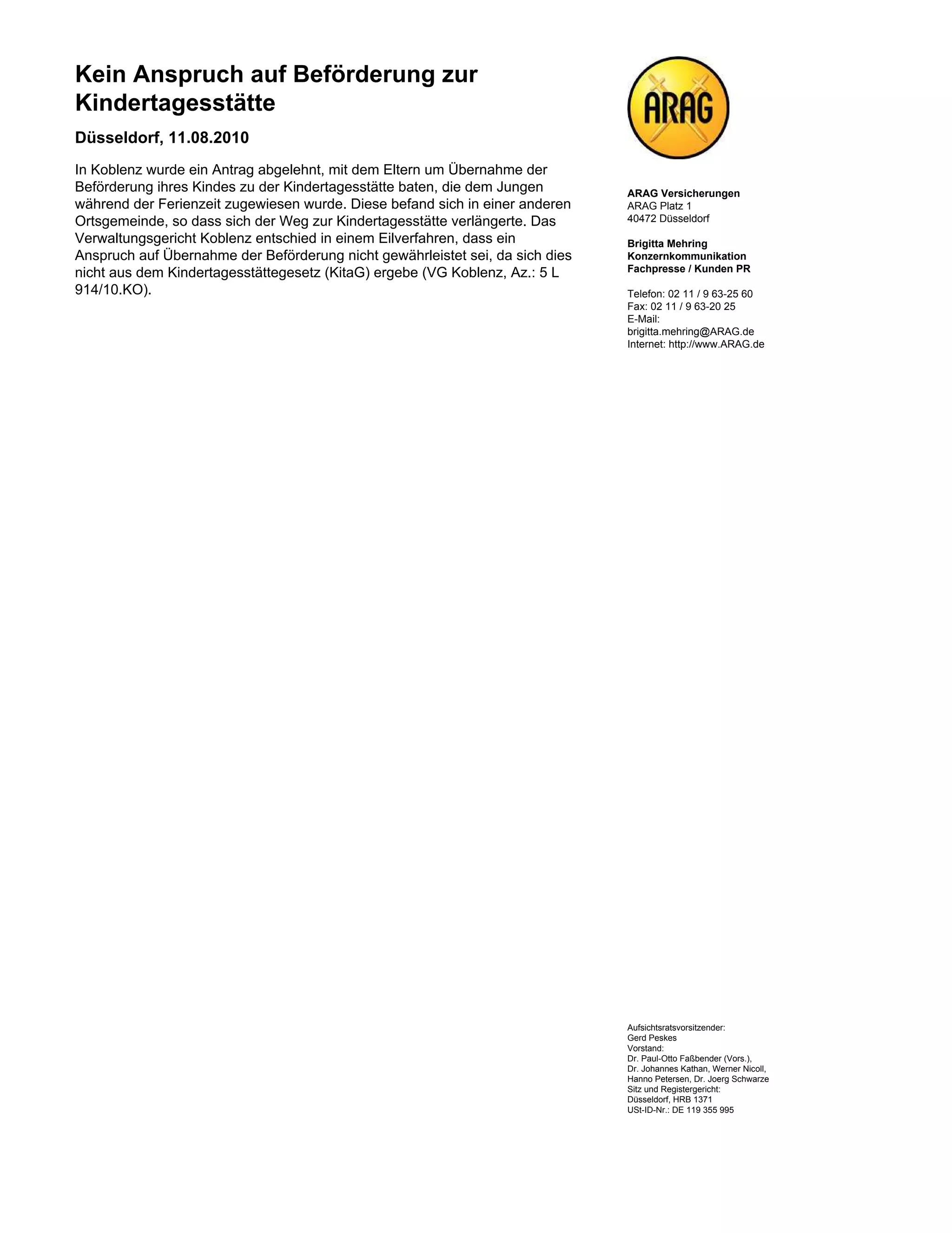 Ein Antrag auf Übernahme der Beförderung eines Kindes zur Kindertagesstätte in Düsseldorf wurde am 11.08.2010 in Koblenz abgelehnt. Das Verwaltungsgericht Koblenz entschied, dass kein Anspruch auf die Übernahme der Beförderung besteht, da dies nicht im Kindertagesstättengesetz vorgesehen ist. Der Fall betraf die Zuweisung des Kindes zu einer Kindertagesstätte in einer anderen Gemeinde während der Ferienzeit.