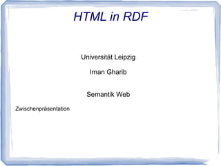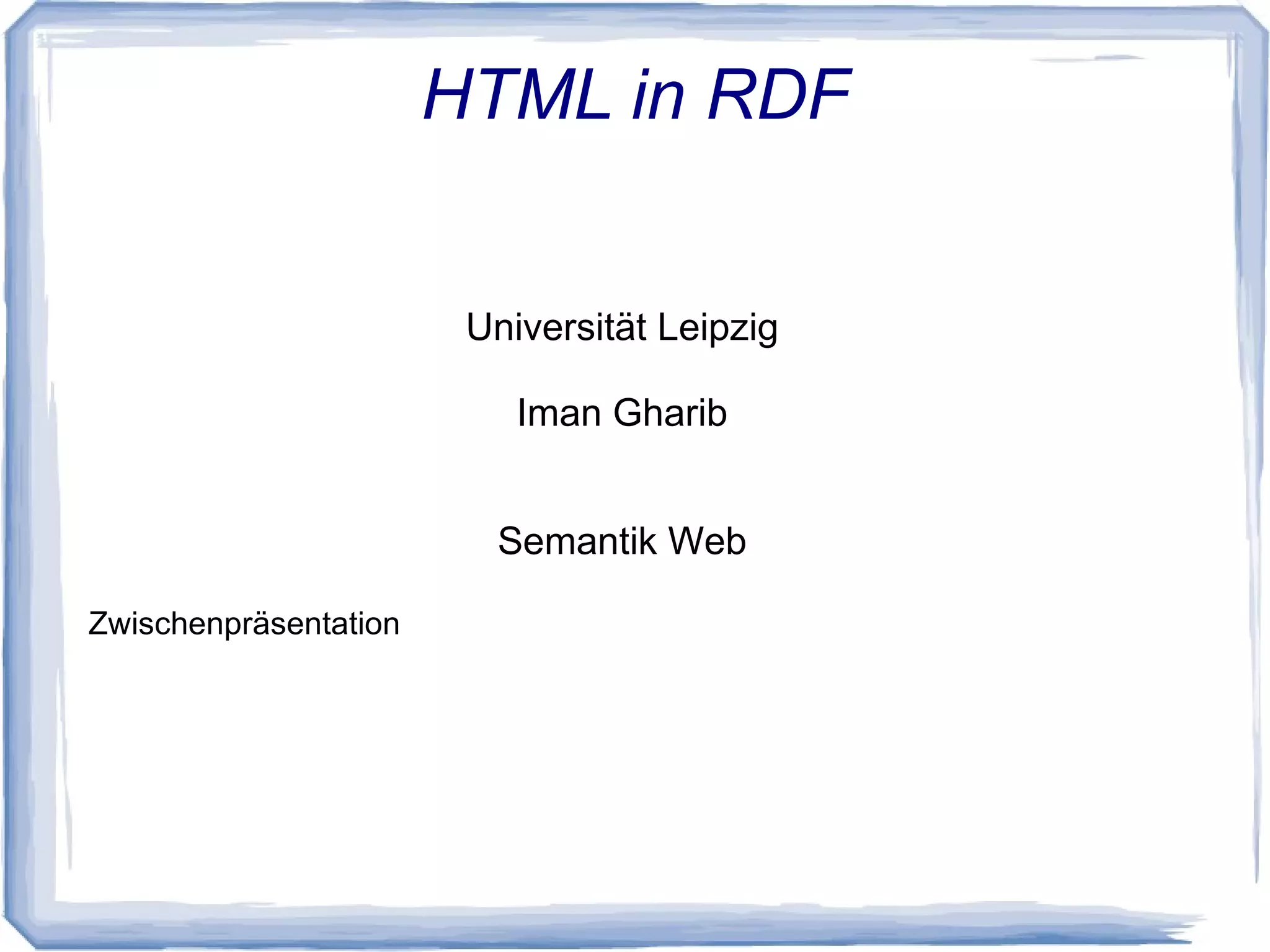 Das Dokument behandelt die Erstellung und Analyse von HTML in RDF im Kontext des Semantischen Webs an der Universität Leipzig. Es erwähnt Ressourcen wie Ethnologue und Videos von der Universität Jena sowie Technologien wie PHP und XPath. Der Fokus liegt auf dem Parsen von HTML und der ordnungsgemäßen Ausgabe von Daten in einer grafischen Benutzeroberfläche.