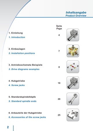 Das Dokument beschreibt die Standardhubgetriebe der Baureihen 'mj' und 'bj', die eine effiziente Umwandlung von Dreh- in Axialbewegung bei kompakter Bauweise ermöglichen. Es enthält Informationen über verschiedene Ausführungen, Antriebskonzepte und Materialien der Hubgetriebe sowie die Möglichkeiten zur Anpassung an kundenspezifische Anforderungen. Darüber hinaus werden die Lieferbedingungen und Optionen für eilige Bestellungen detailliert erläutert.