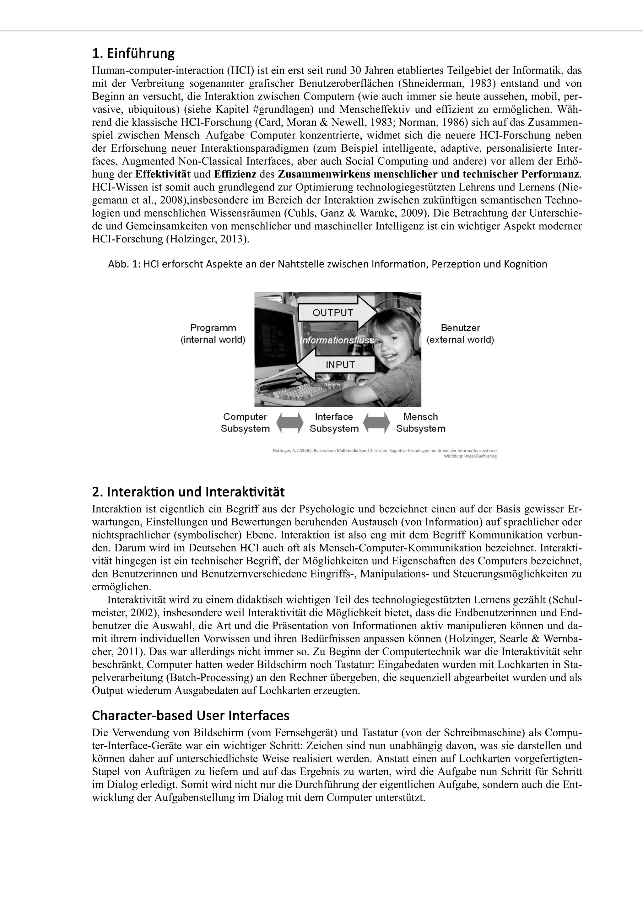 Die Human-Computer-Interaktion (HCI) ist ein wichtiges Teilgebiet der Informatik, das die effiziente und effektive Interaktion zwischen Mensch und Computer untersucht und sich zunehmend auf die Verbesserung von Benutzeroberflächen konzentriert, um individuelle Bedürfnisse zu erfüllen. Die Entwicklung von interaktiven Systemen von der klassischen Kommandozeileneingabe zu heutigen grafischen Benutzeroberflächen (GUIs) und darüber hinaus zu multimodalen und intelligenten Schnittstellen eröffnet neue Möglichkeiten für das technologiegestützte Lernen. Zukünftig werden personalisierte und adaptive Interfaces erwartet, die den Nutzern eine dynamische Unterstützung bei komplexen Aufgaben bieten und gleichzeitig die Benutzerfreundlichkeit durch geeignete Usability- und Gestaltungsmethoden sicherstellen.