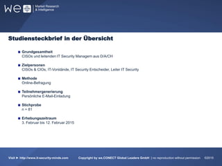 Die Studie "IT Security Perspektive 2015" umfasst eine Umfrage unter CISOs und leitenden IT-Security-Managern aus der D/A/CH-Region, um aktuelle Herausforderungen, Technologietrends und Budgetverteilungen in der IT-Sicherheit zu ermitteln. Zentrale Erkenntnisse zeigen, dass Cloud-Sicherheit, Mobile Device Management und das Internet der Dinge (IoT) als die größten Herausforderungen betrachtet werden, während der Stellenwert der IT-Sicherheit in Unternehmen steigt. Die Studie bietet wichtige Einblicke zur strategischen Ausrichtung in der IT-Sicherheit für die kommenden Jahre.
